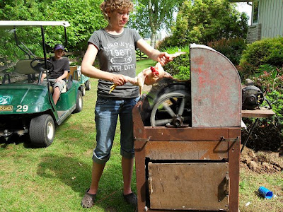 After we're sure they are dead, Dad soaks them in scalding water to loosen up the feathers. Doesn't he look like an impressive chicken soaker?